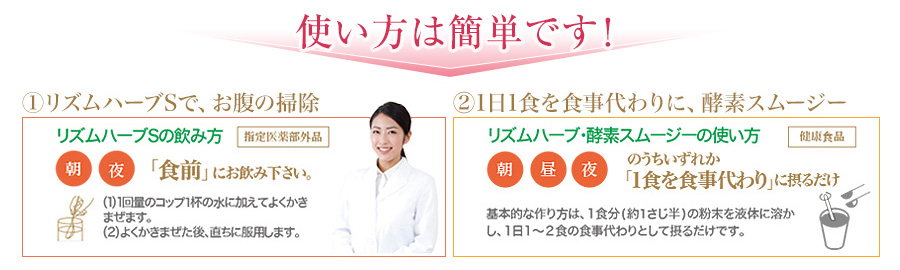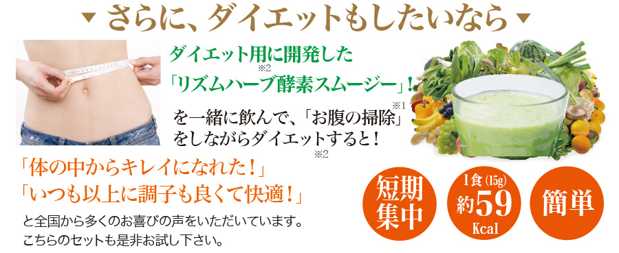 ※2 リズムハーブ・酵素スムージーの効果。通常食との置き換えによるカロリー制限の結果です。1食(15g)約59Kcal。